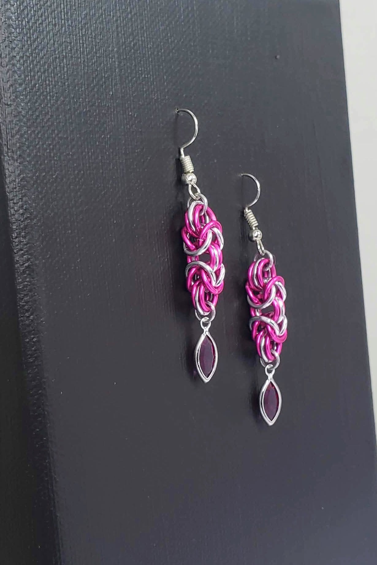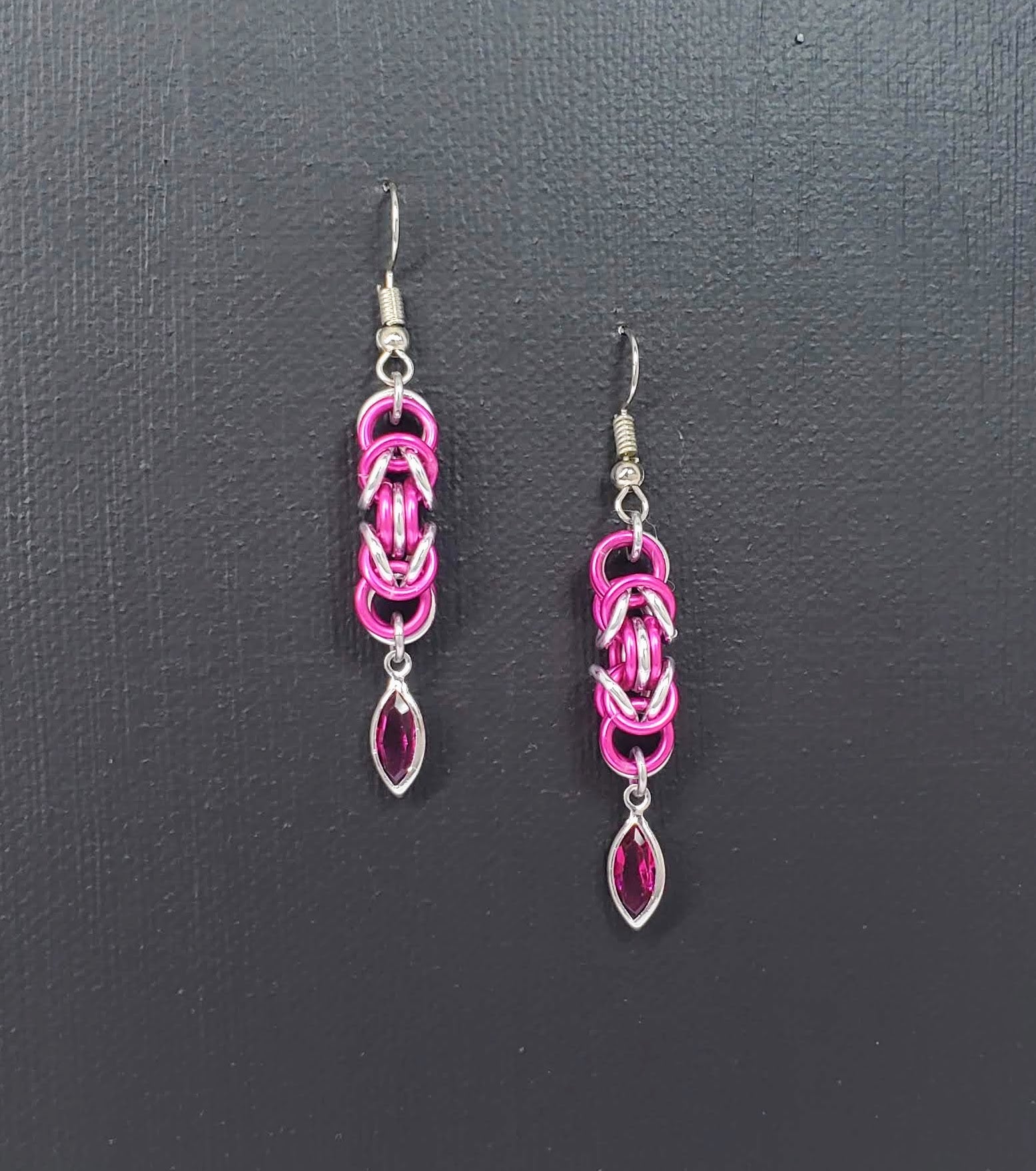 Vibrant hot pink anodized aluminum links are accented with Swarovski marquise dangle.