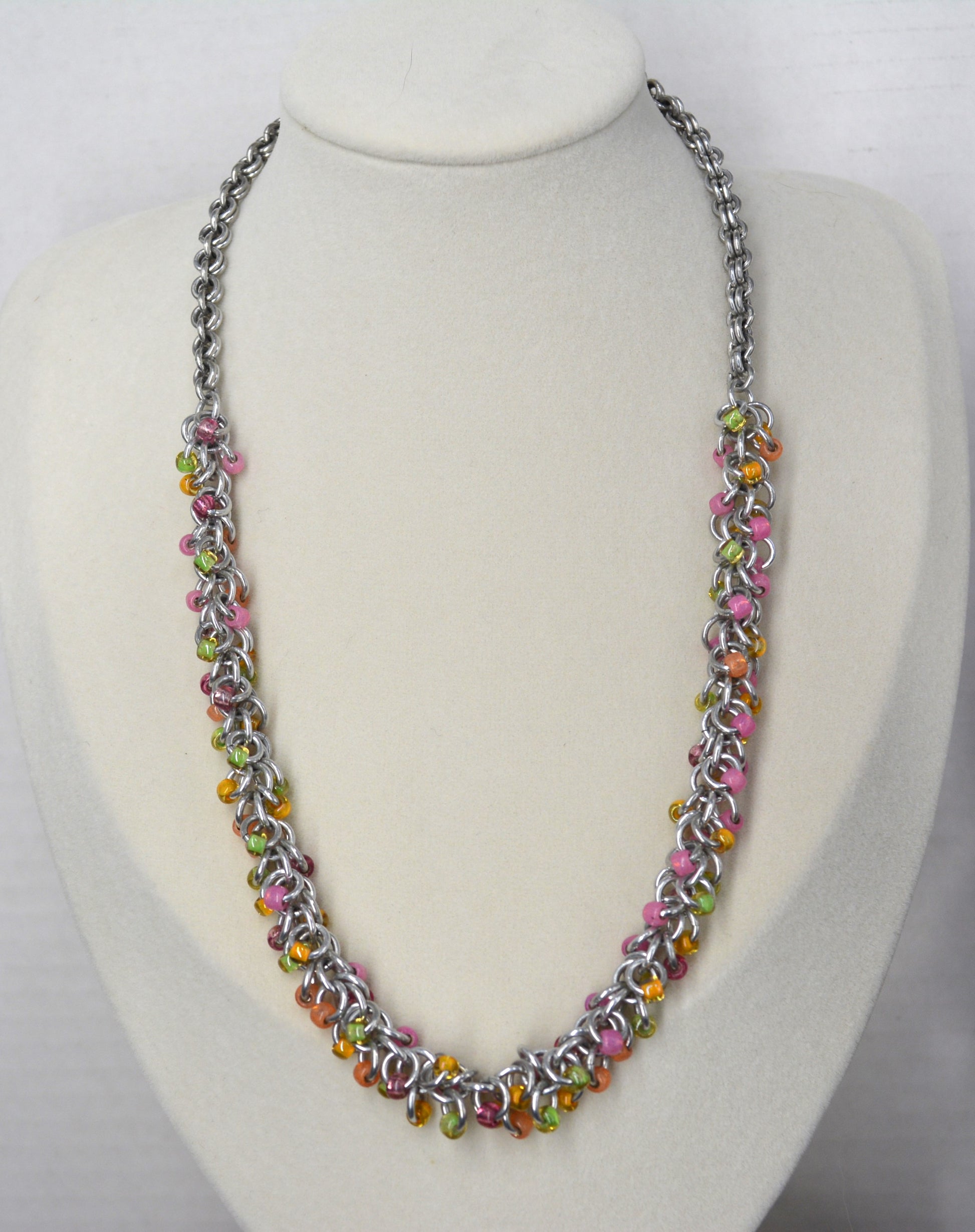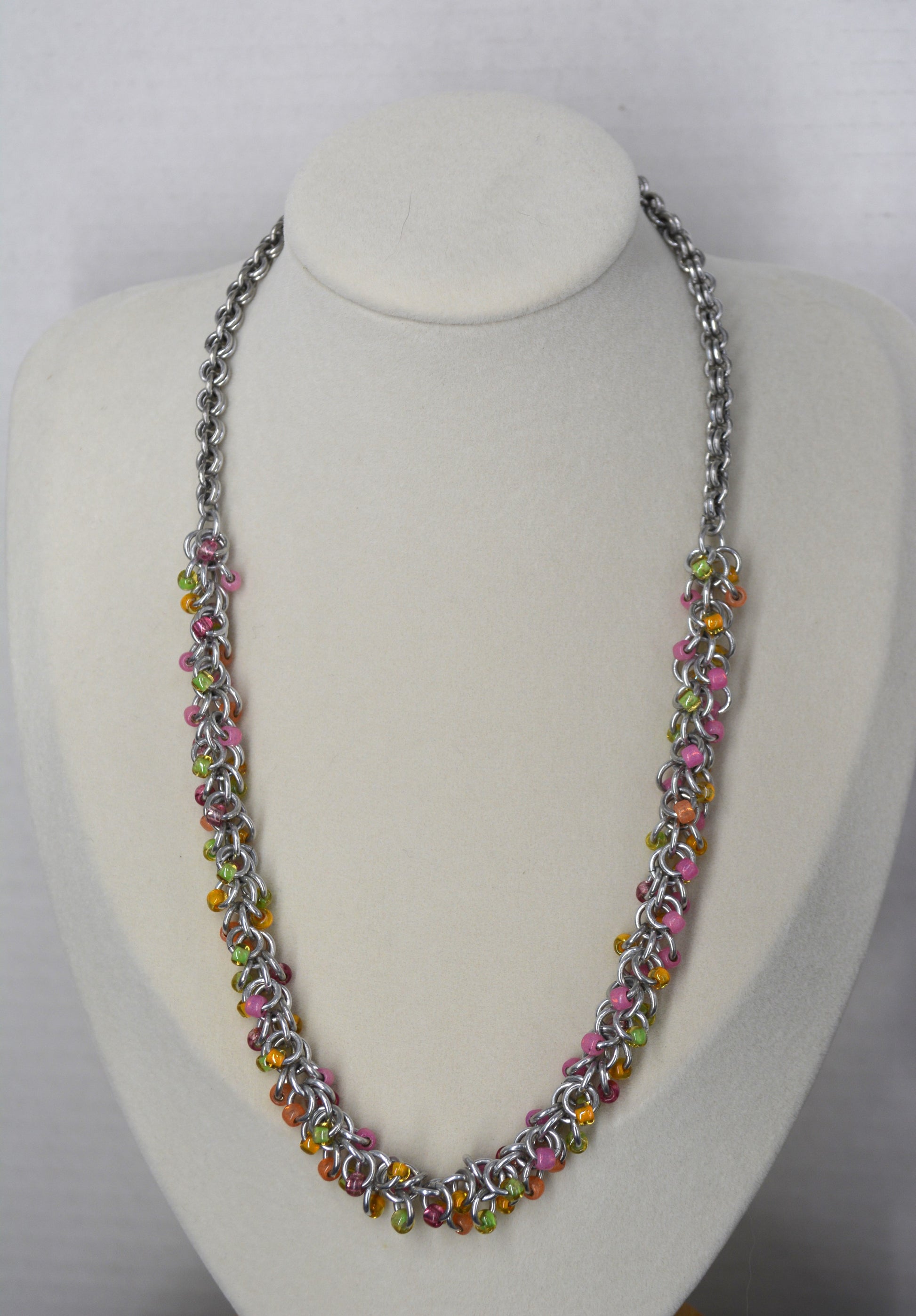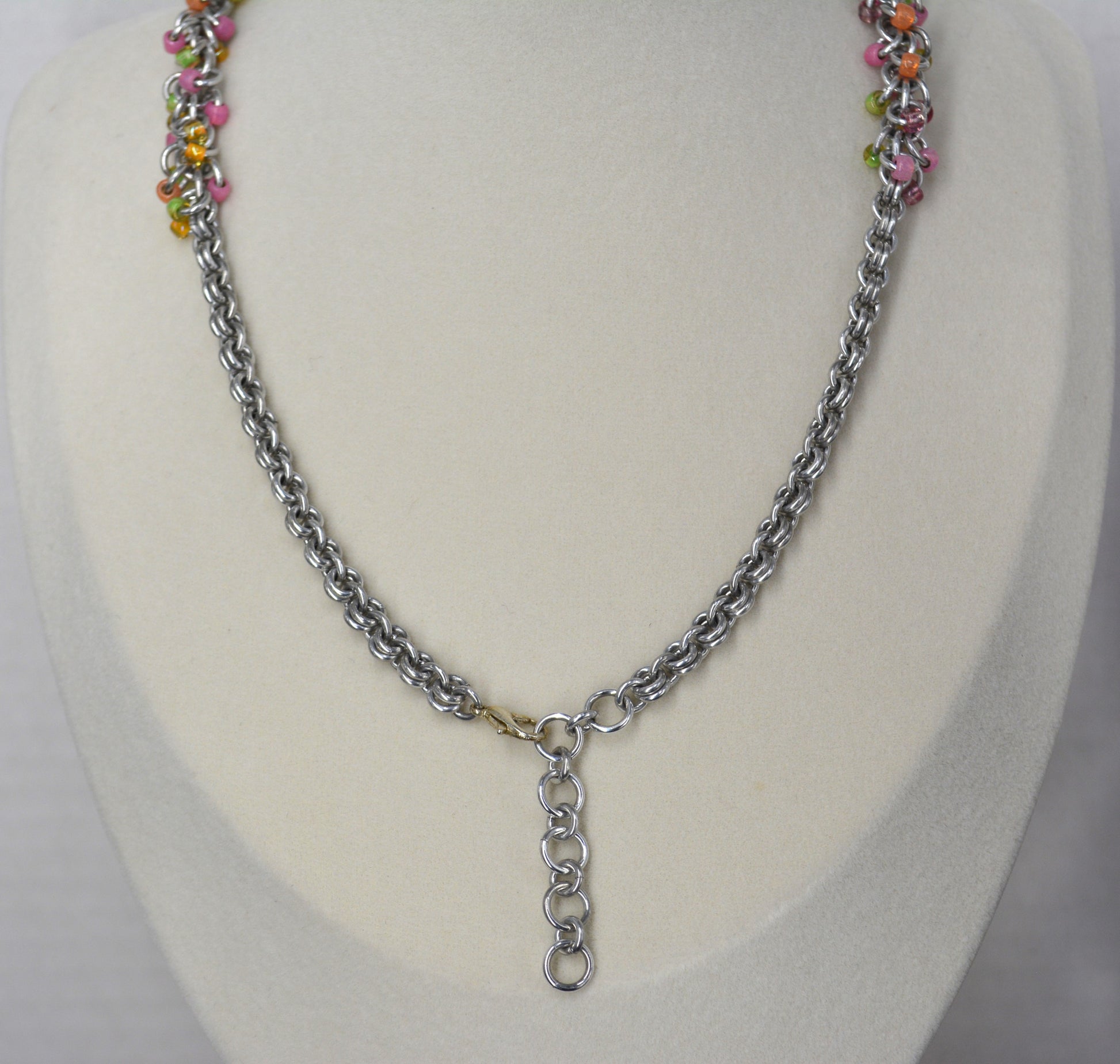 Shaggy loops done up in playful Springtime colors adds a touch of cheer to your day. 2 in 1 chain with bright aluminum links connects with a lobster claw clasp with extention chain.