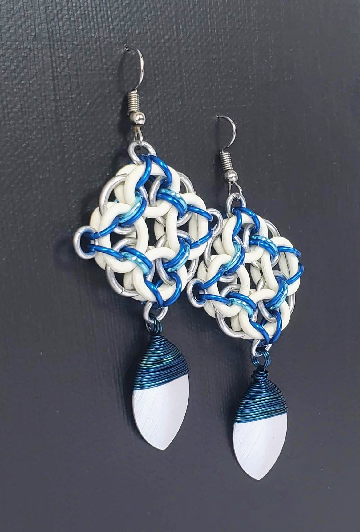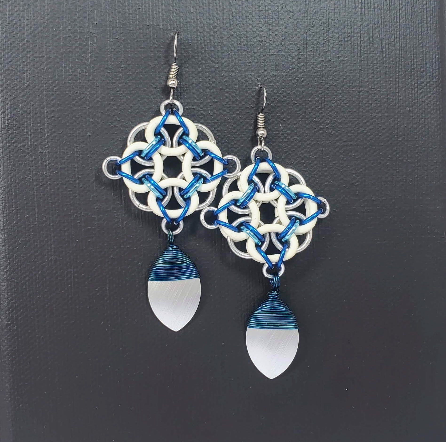 Silicone rings with bright and anodized aluminum links and a wire wrapped scale to boot. Dangle is about 3 1/2cm wide by 6 1/2cm long