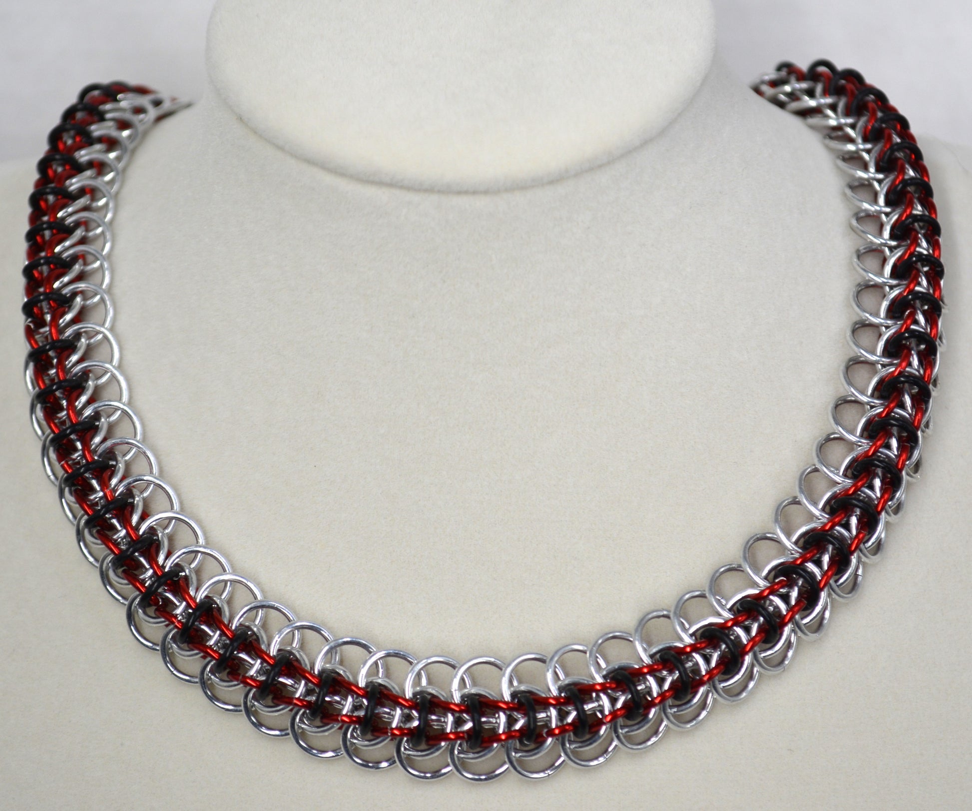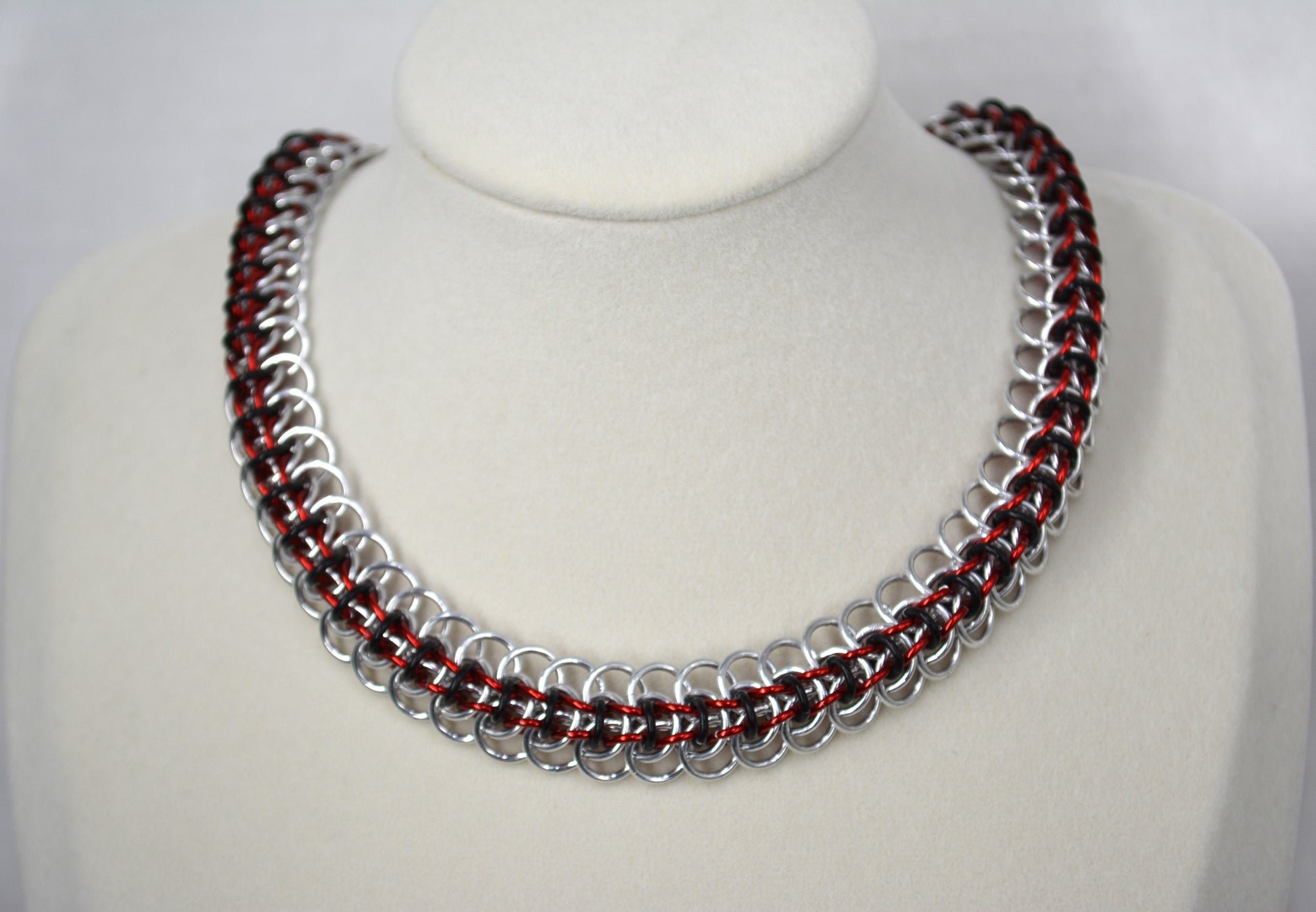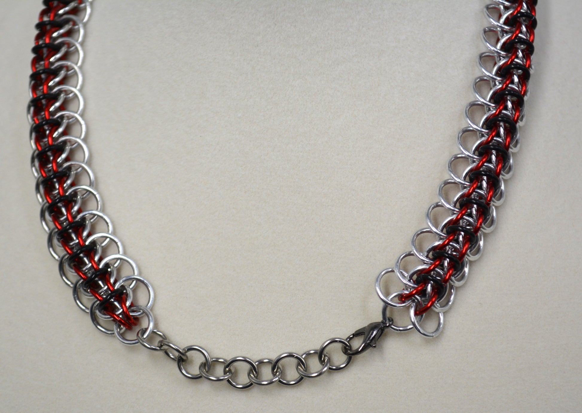 Kitsune weave created with bright aluminum, black and red anodized aluminum, lobster claw clasp with extention chain, chocker/collar.