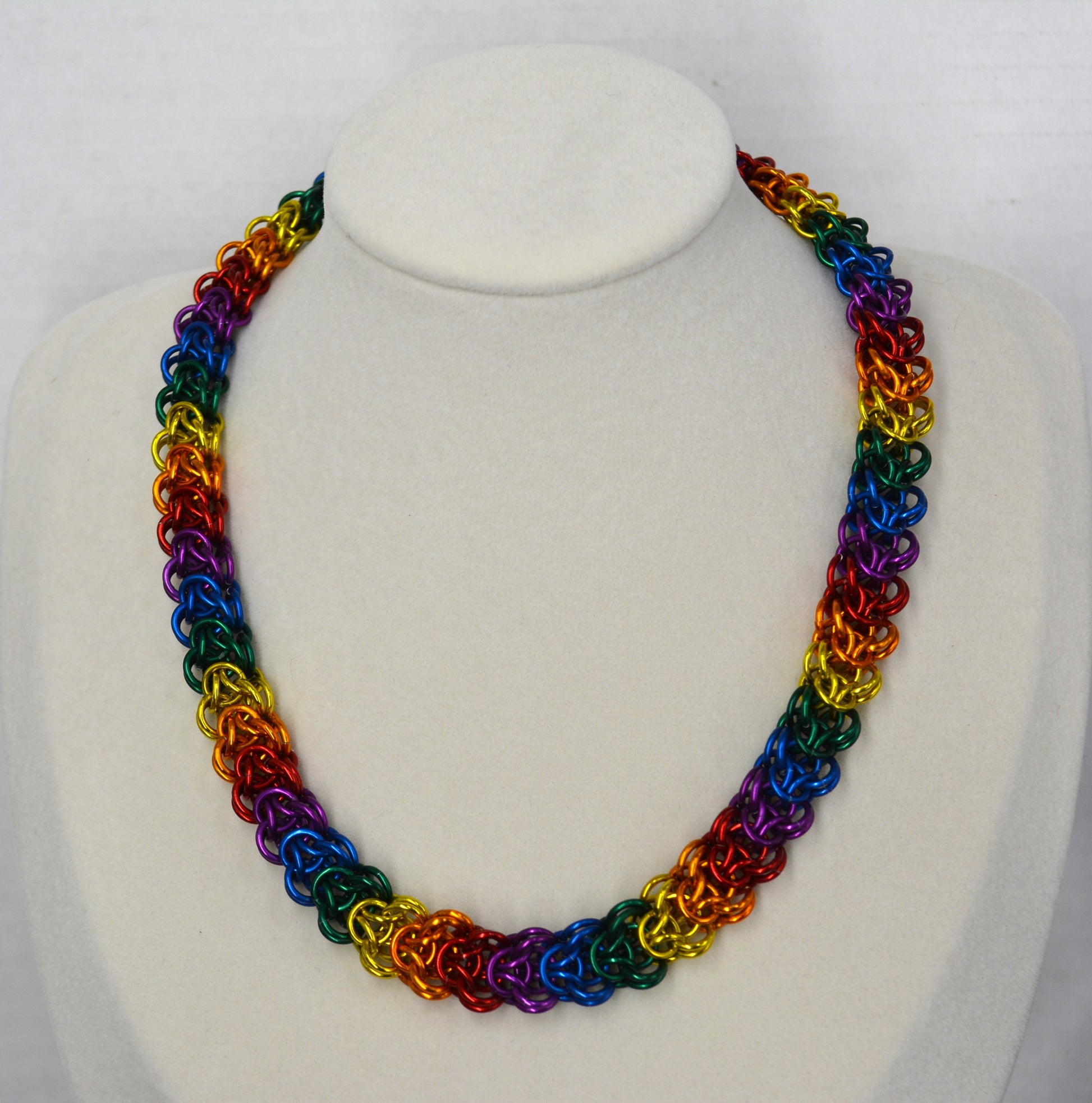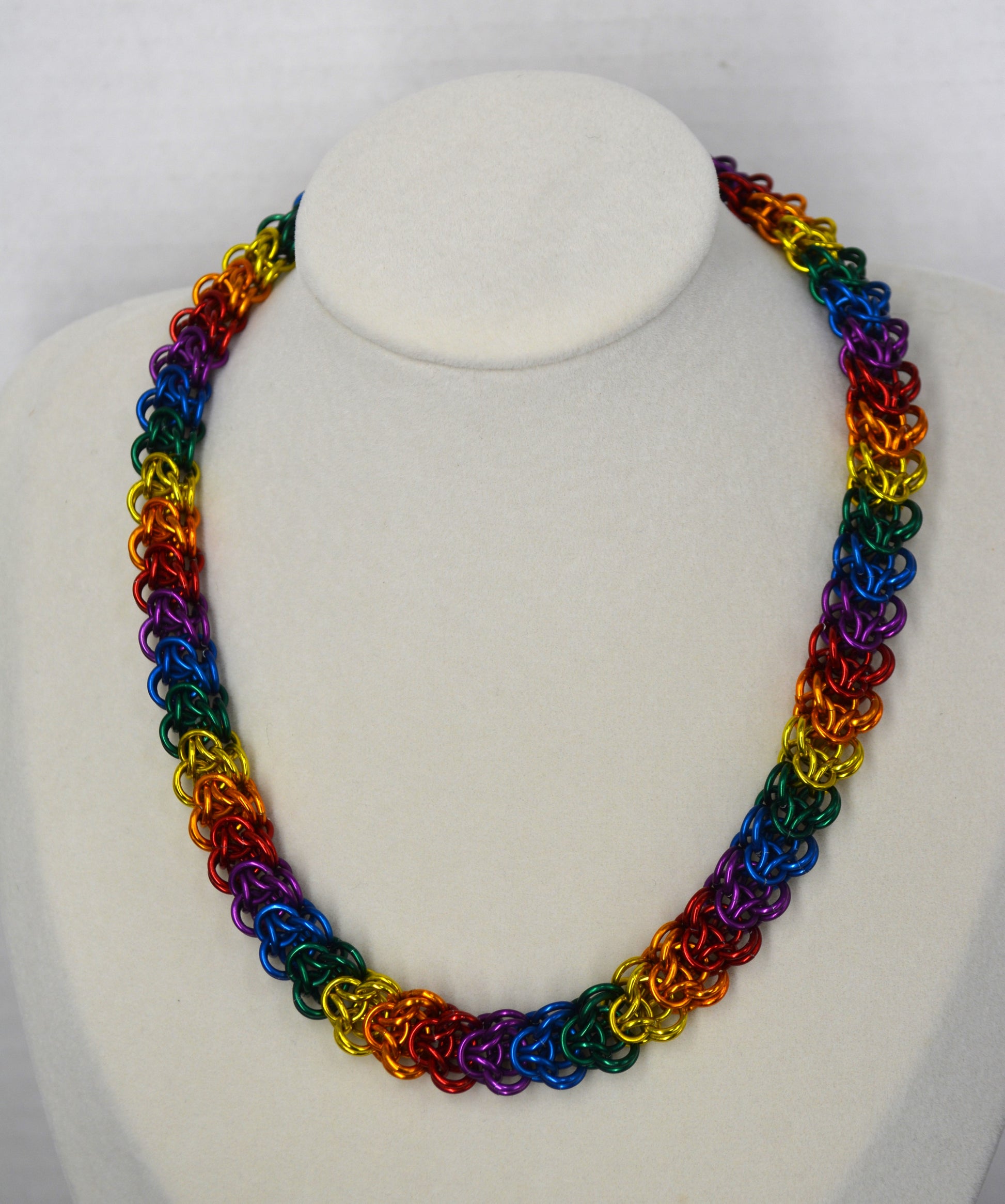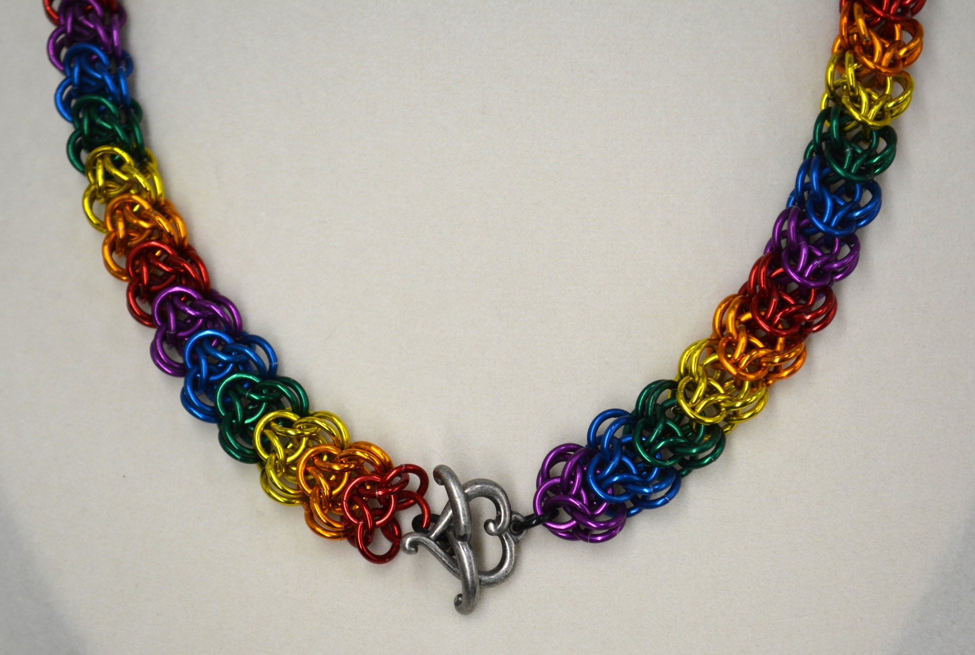 Spinal Elf weave created with colorful 18ga anodized aluminum, good tactile feel. Heart toggle clasp.