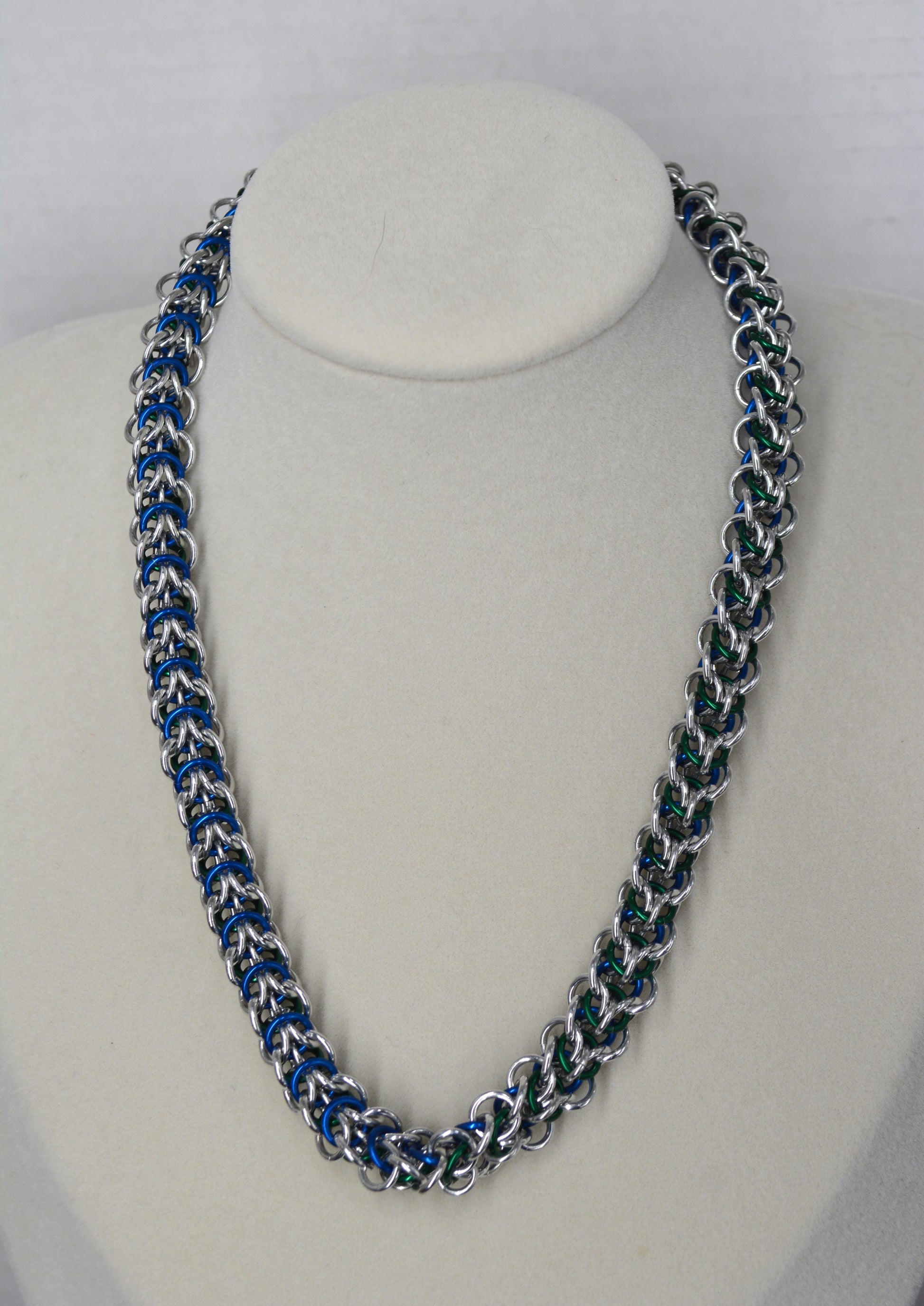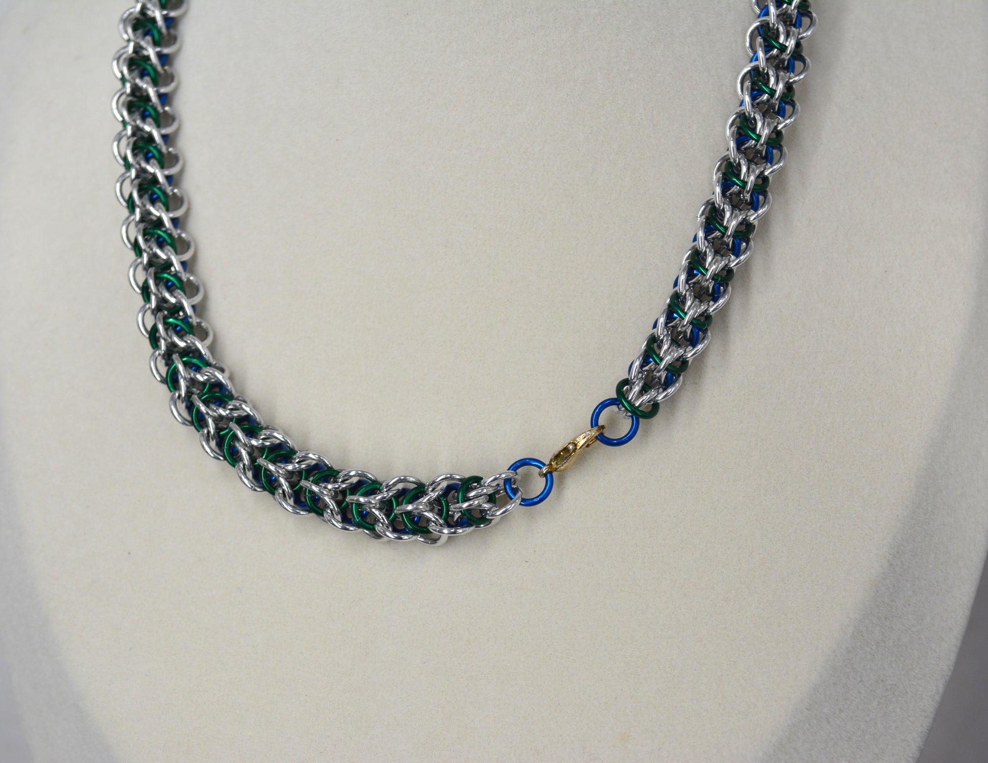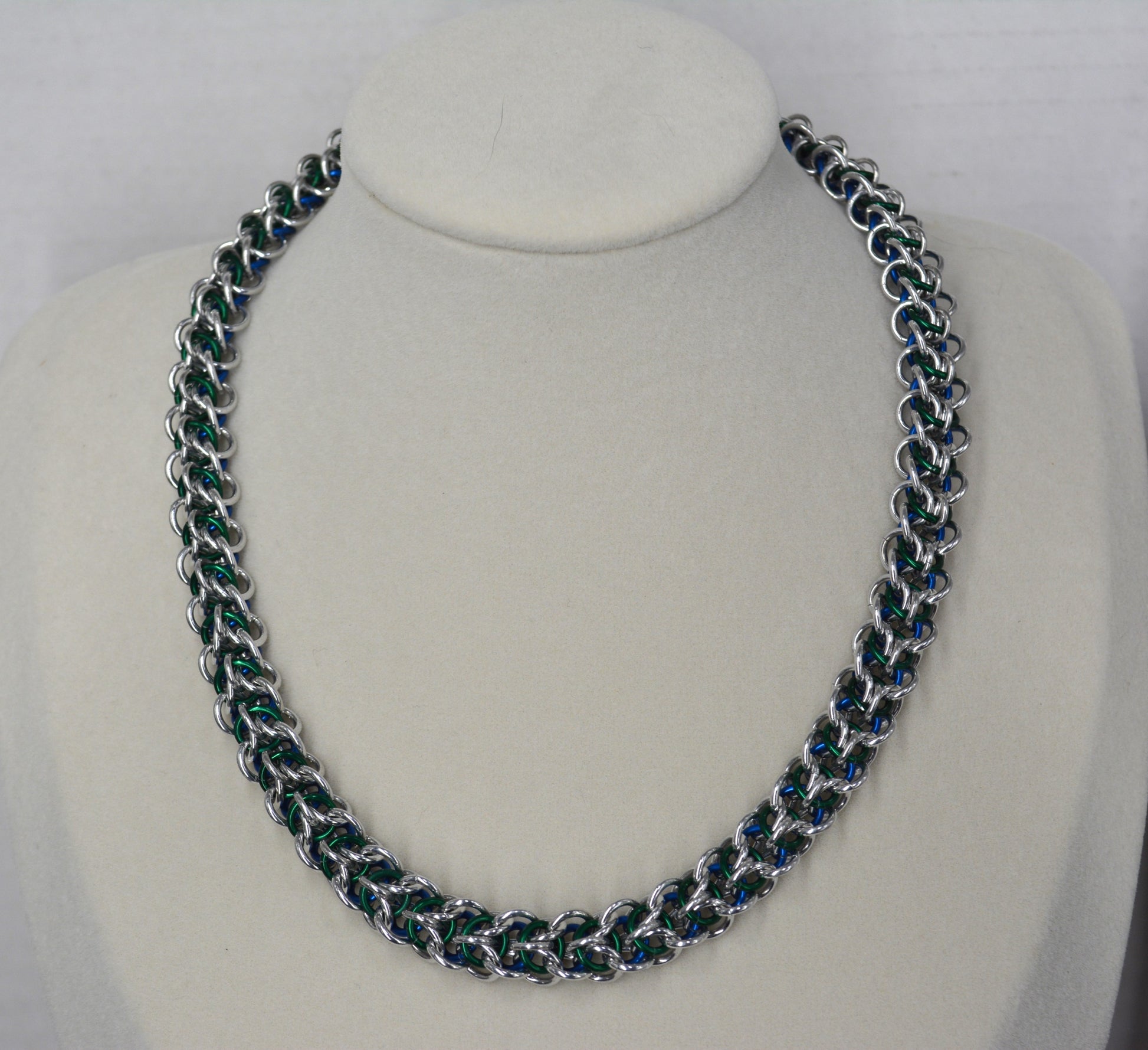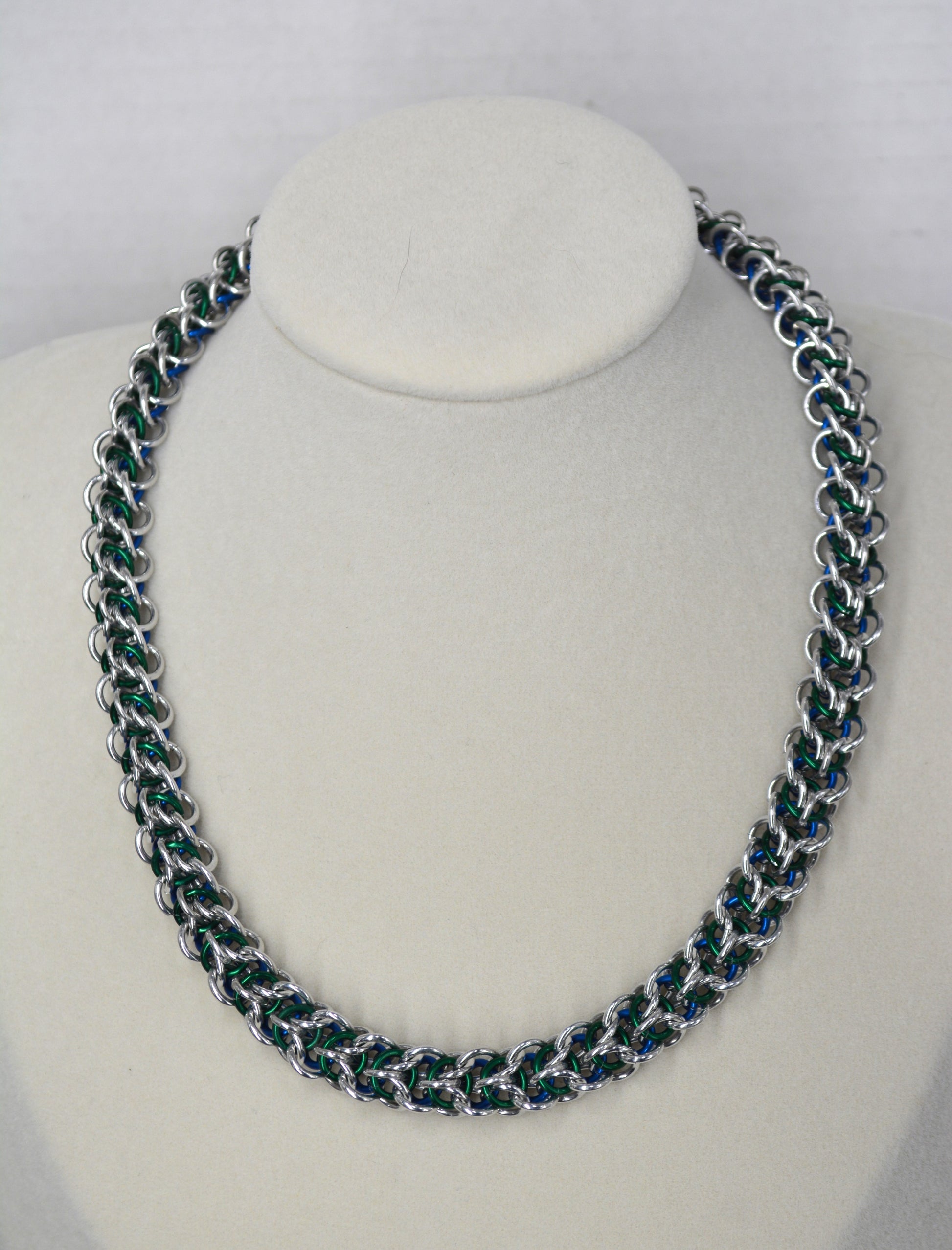 Waterlily Elf weave, dark green on the front and dark blue on the back anodized aluminum and bright aluminum, with lobster claw clasp. 18ga links.