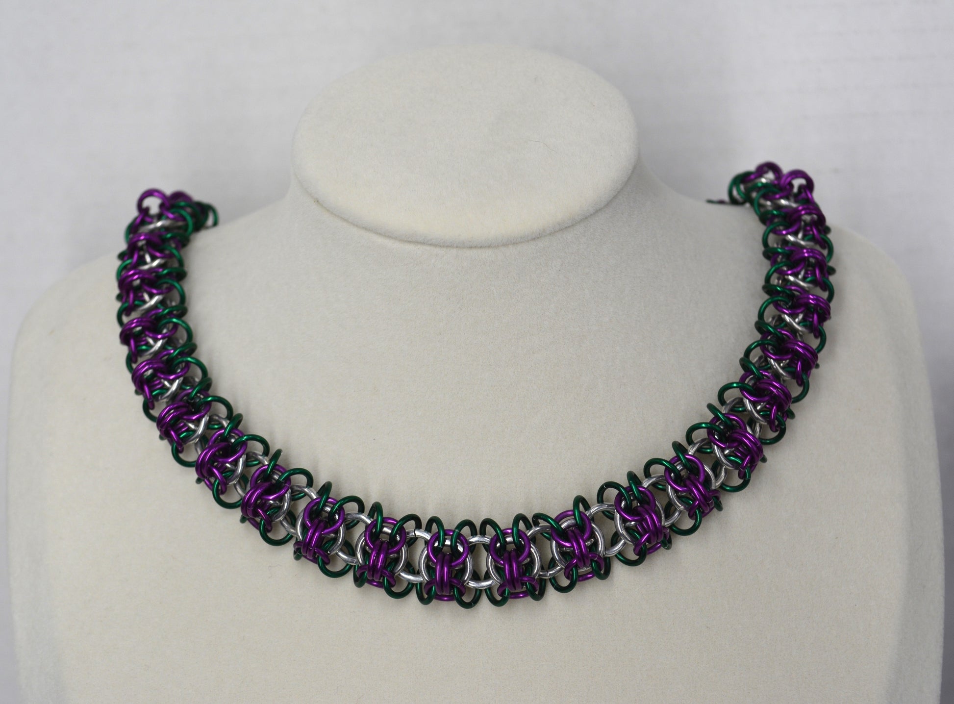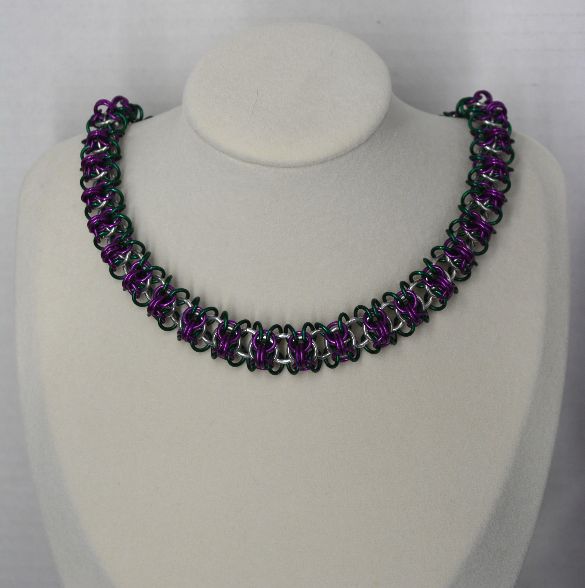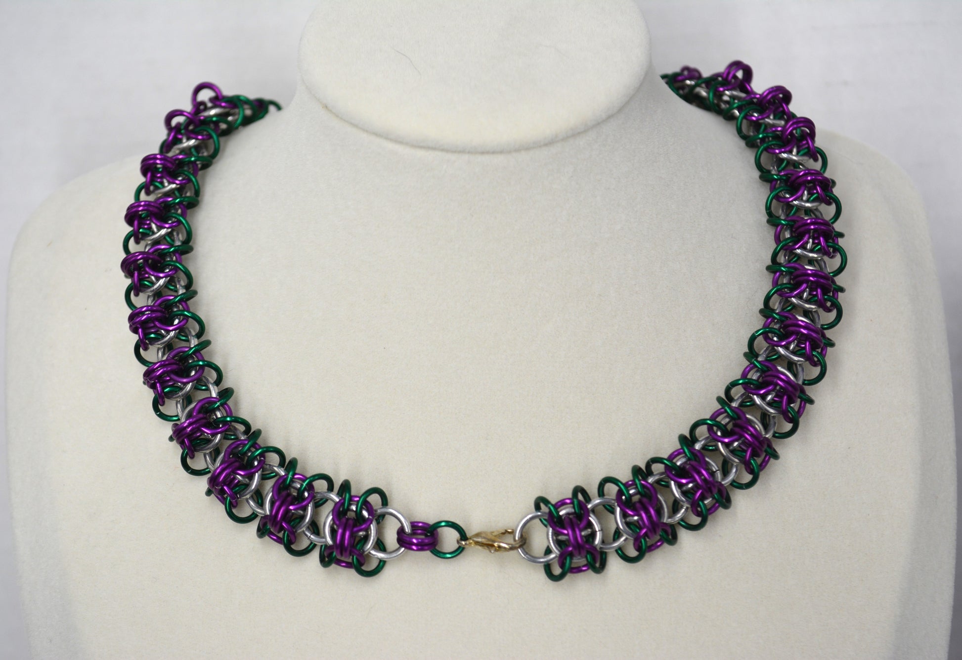 Sprite weave, 18ga dark green and dark purple anodized aluminum and 16ga bright aluminum with a lobster claw clasp.