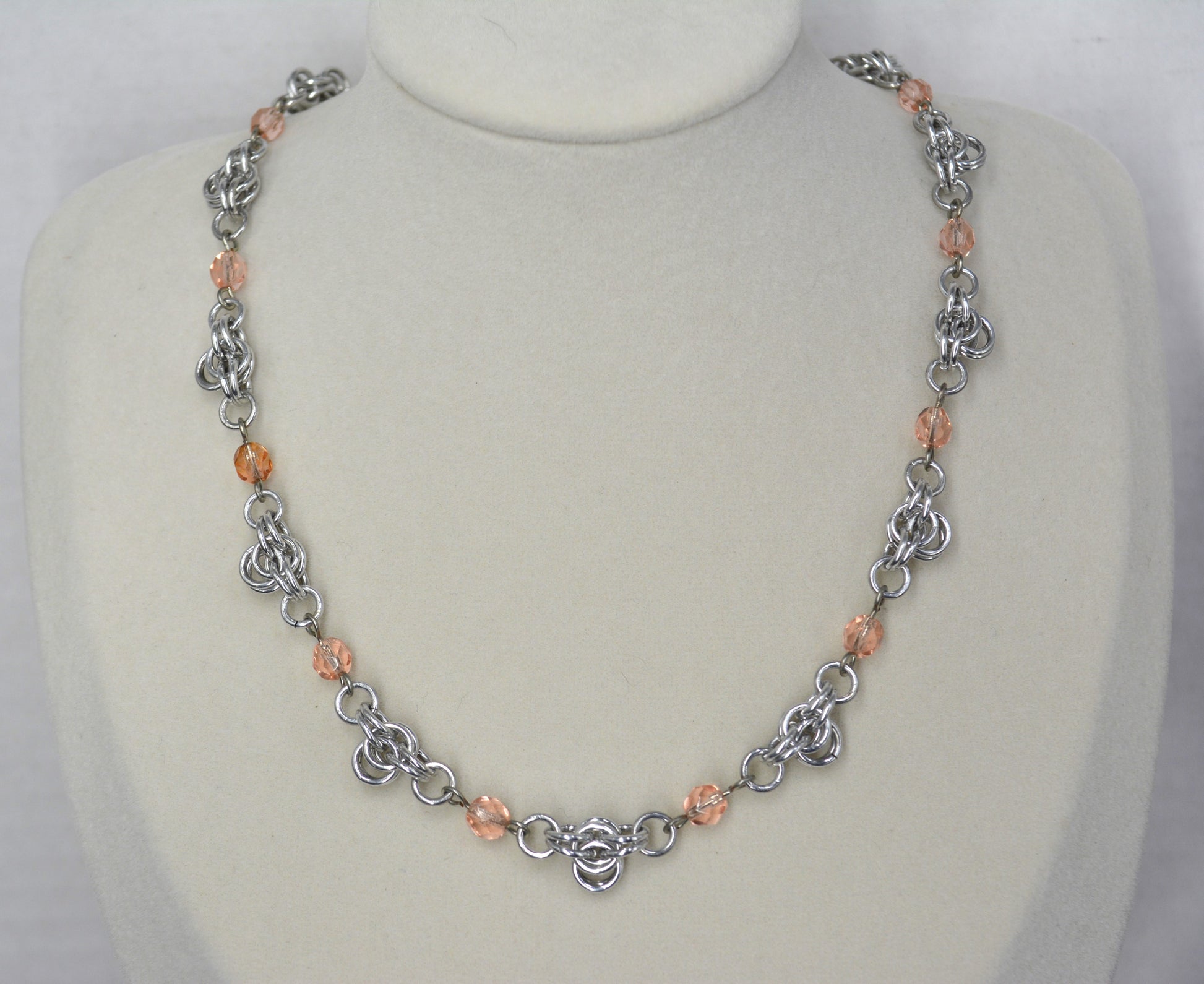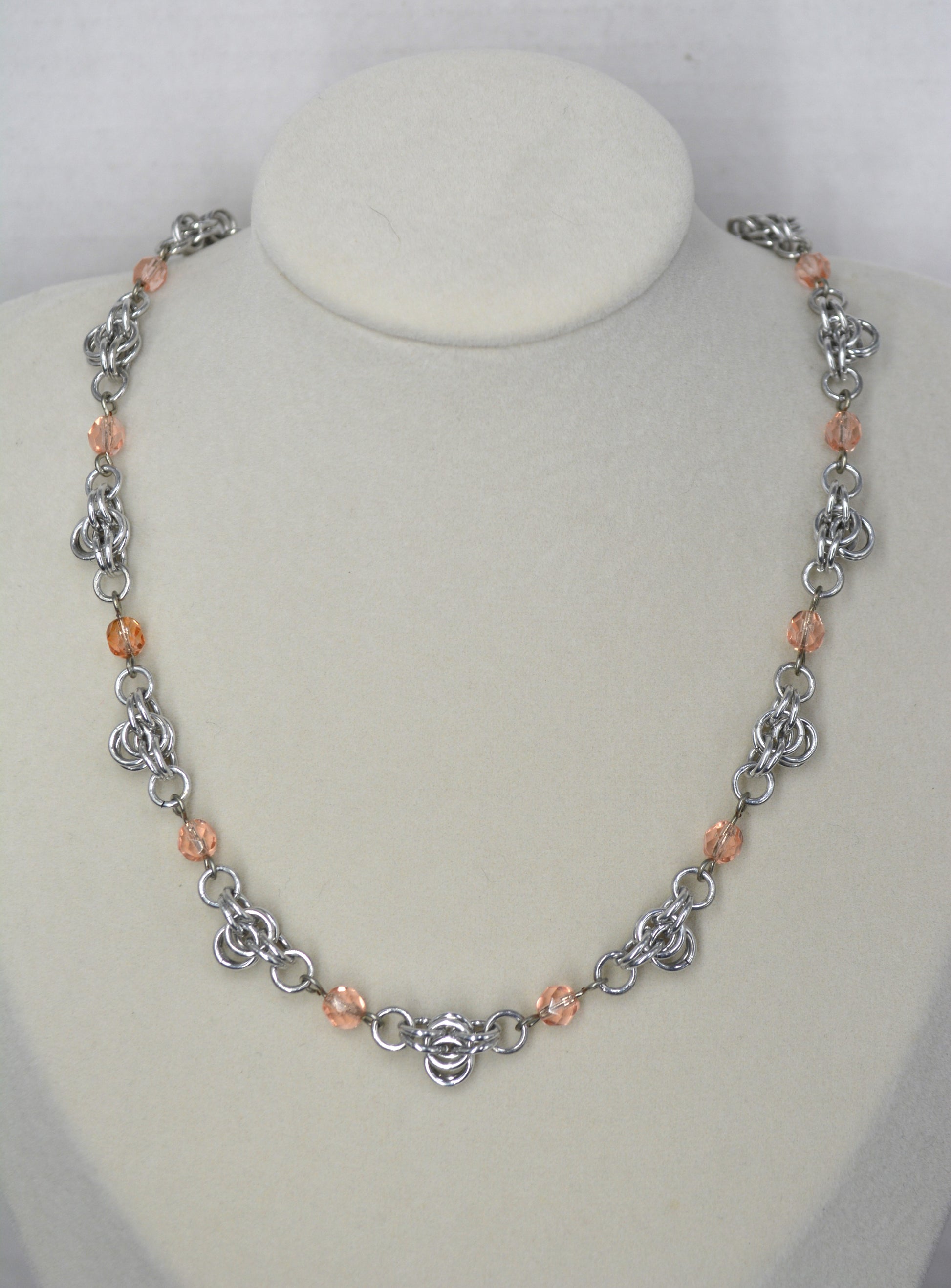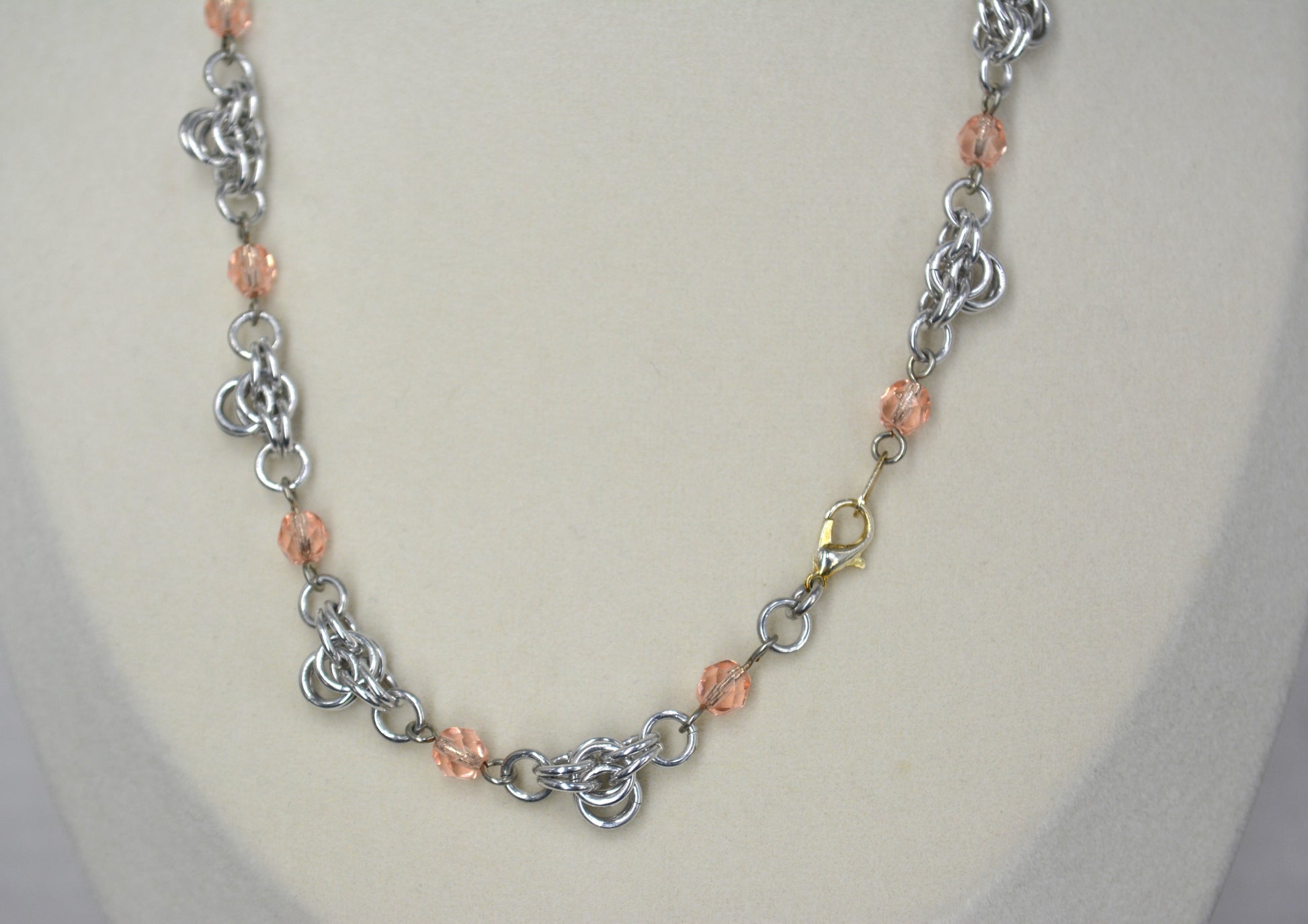 Olivia weave with bright aluminum 18ga links and light peachy pink glass beads, lobster claw clasp.