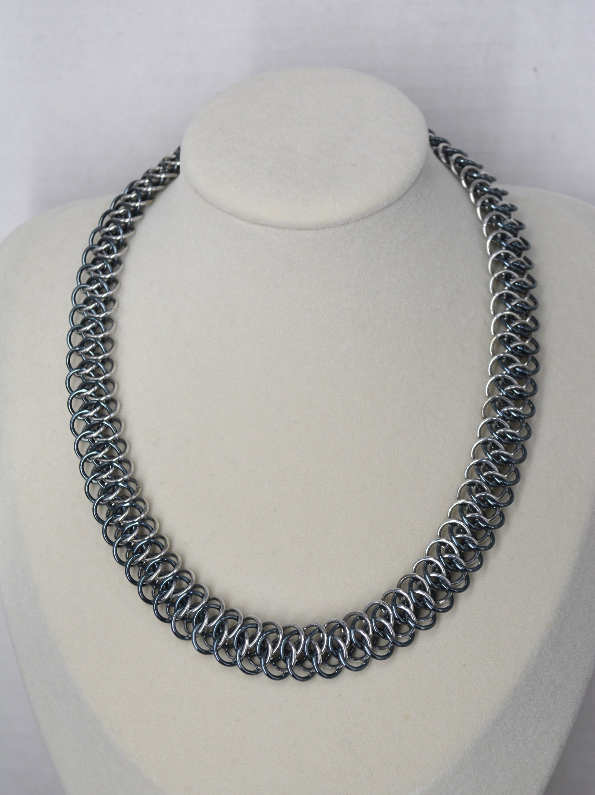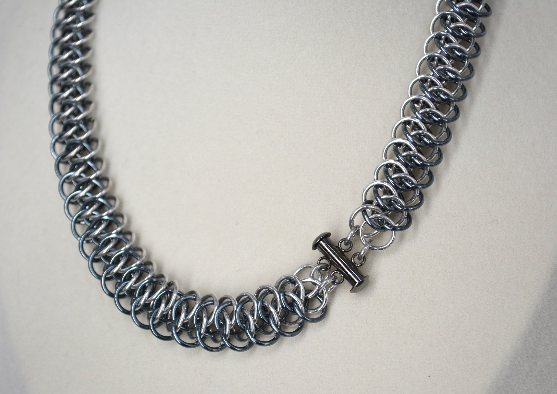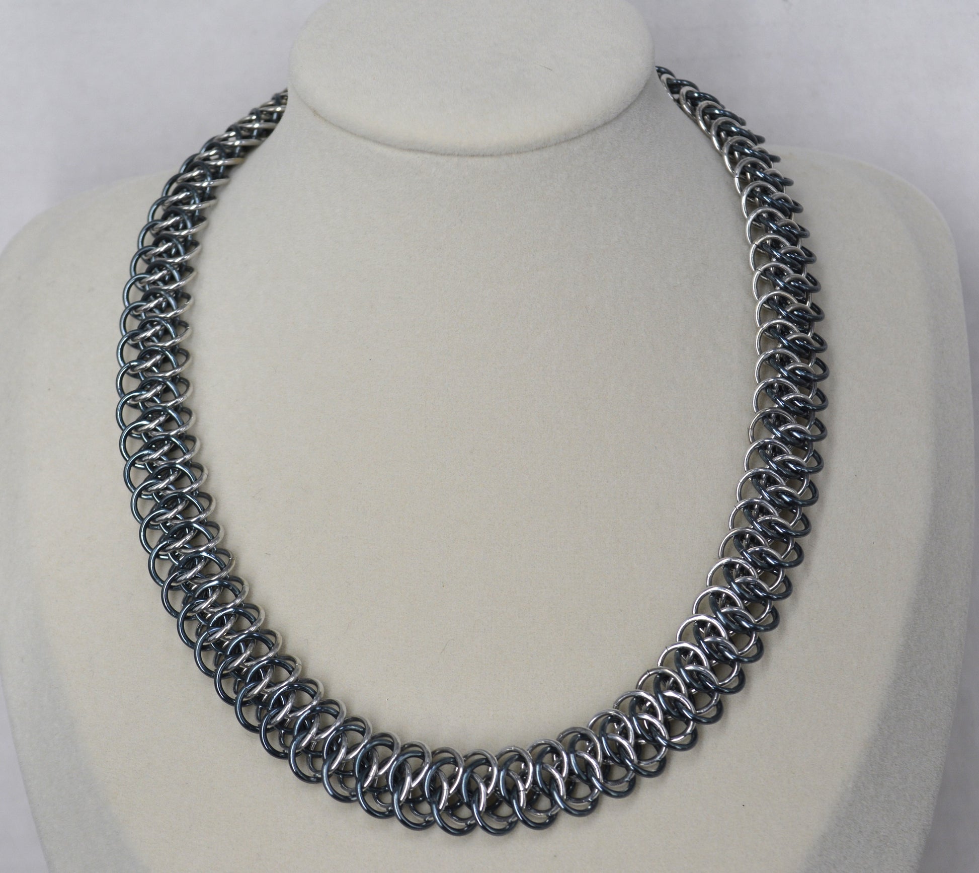 Arkham weave with black ice anodized aluminum and bright aluminum 18ga links and a gunmetal bar clasp closure. Feels great to fidget with.