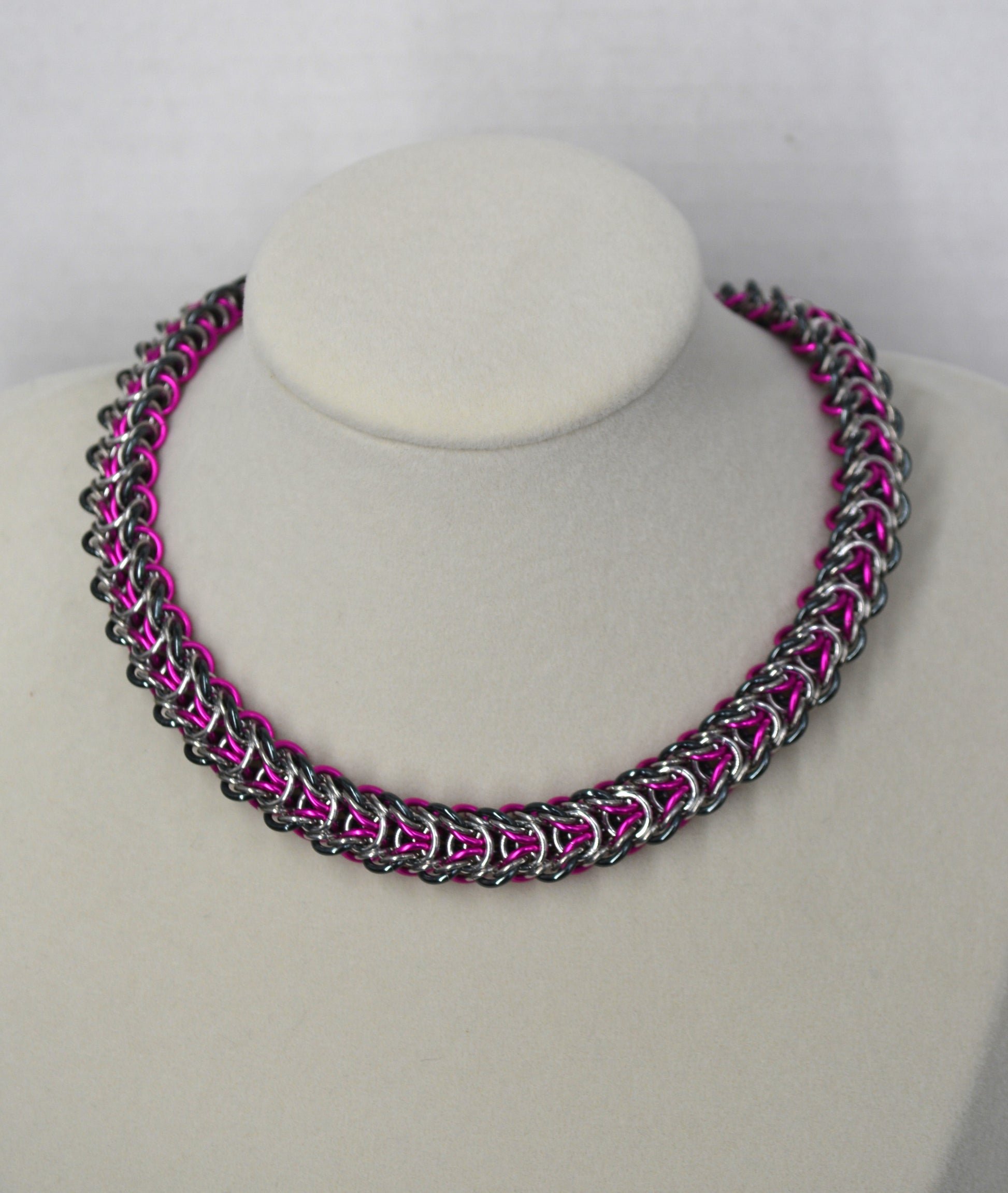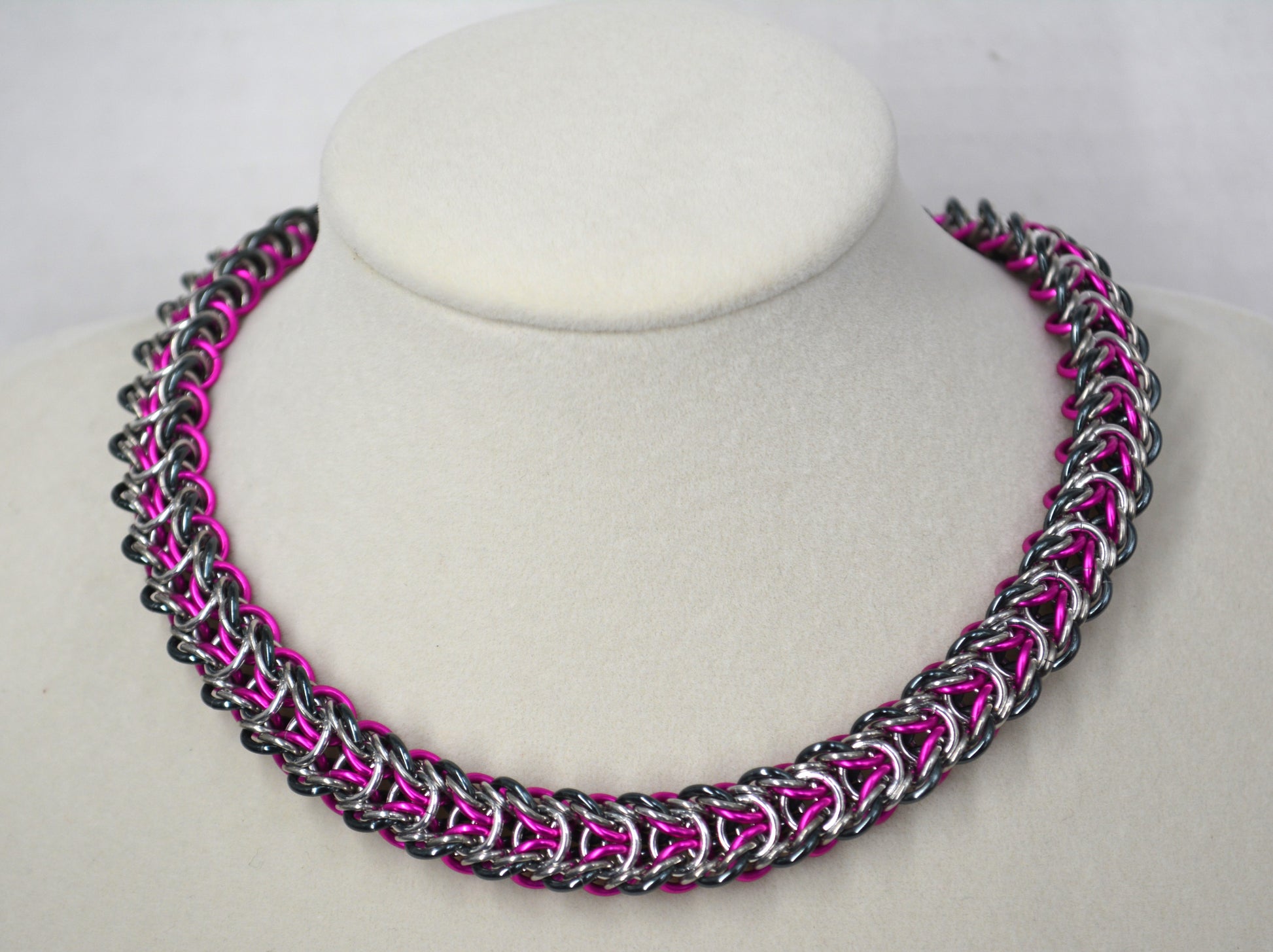 Moon Elf weave is a really fun pattern but also strangely loose. Only for those with patience. The small links on the side will possibly pop out out of place when not being worn. It requires you to gently wiggle them back into place. Stays well in place when worn. If you find that's not for you but you like the concept of the weave, please check out my other Elf weave variances in necklaces and bracelets. Bright aluminum with pink and black ice anodized aluminum links with a heart toggle clasp.