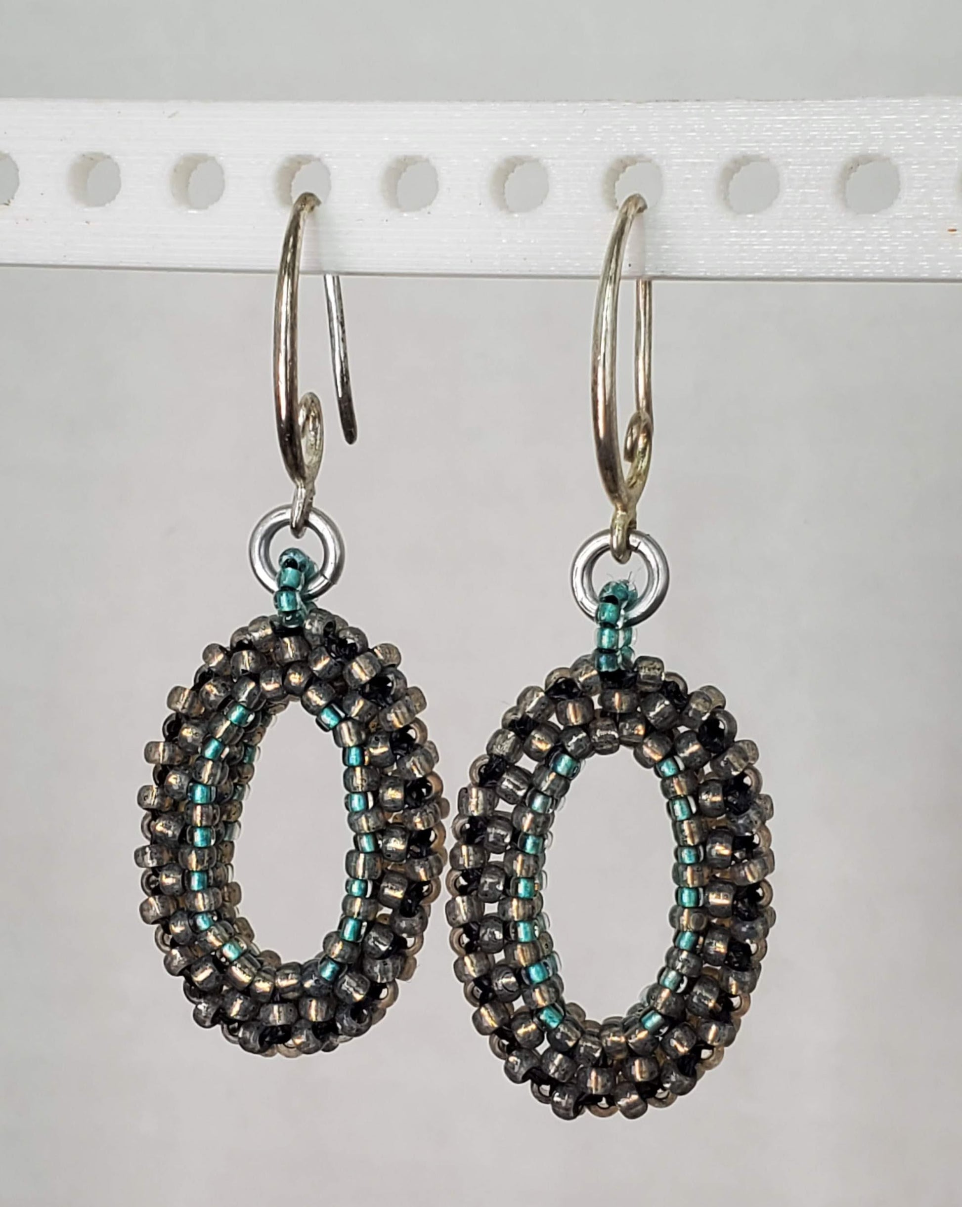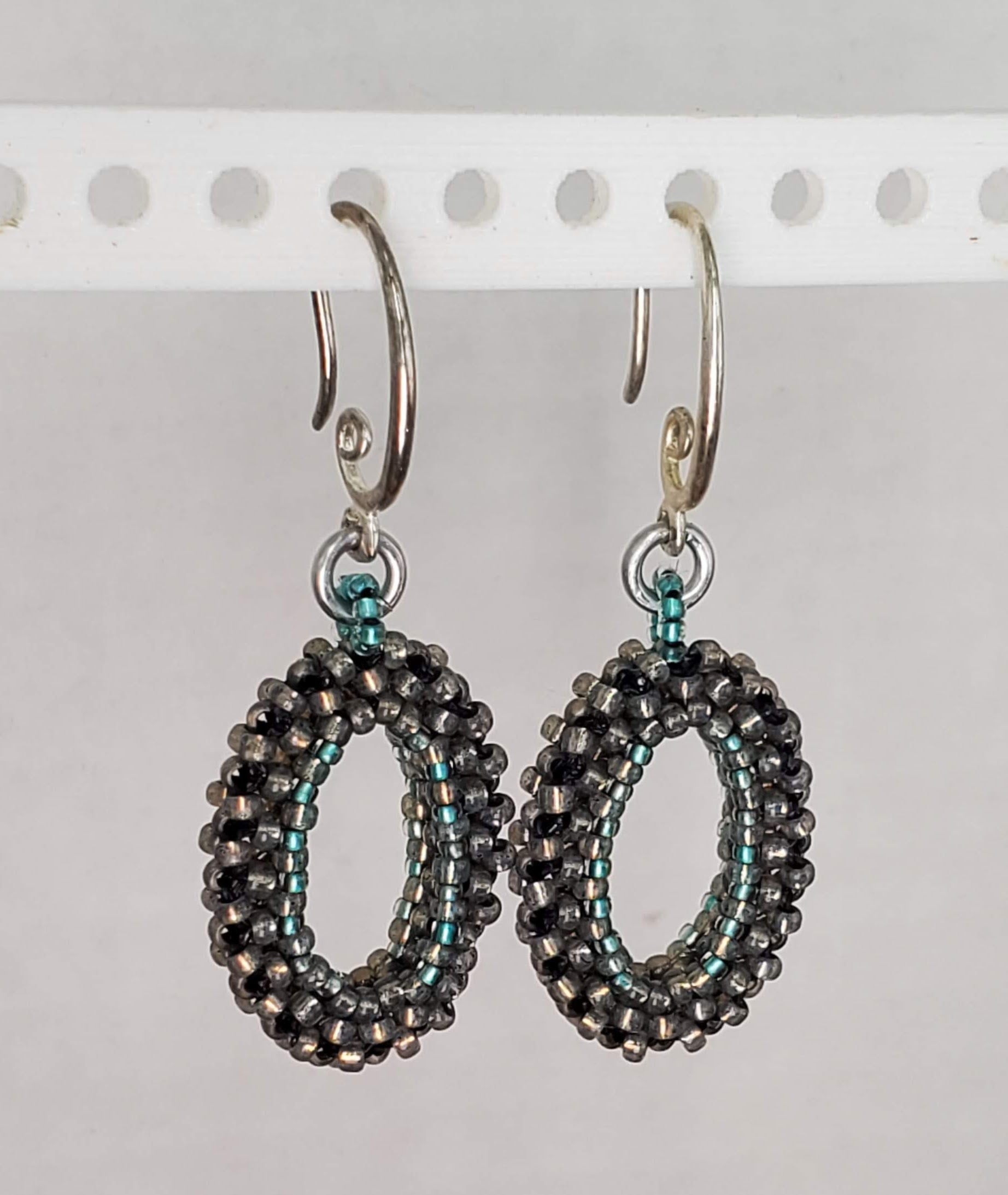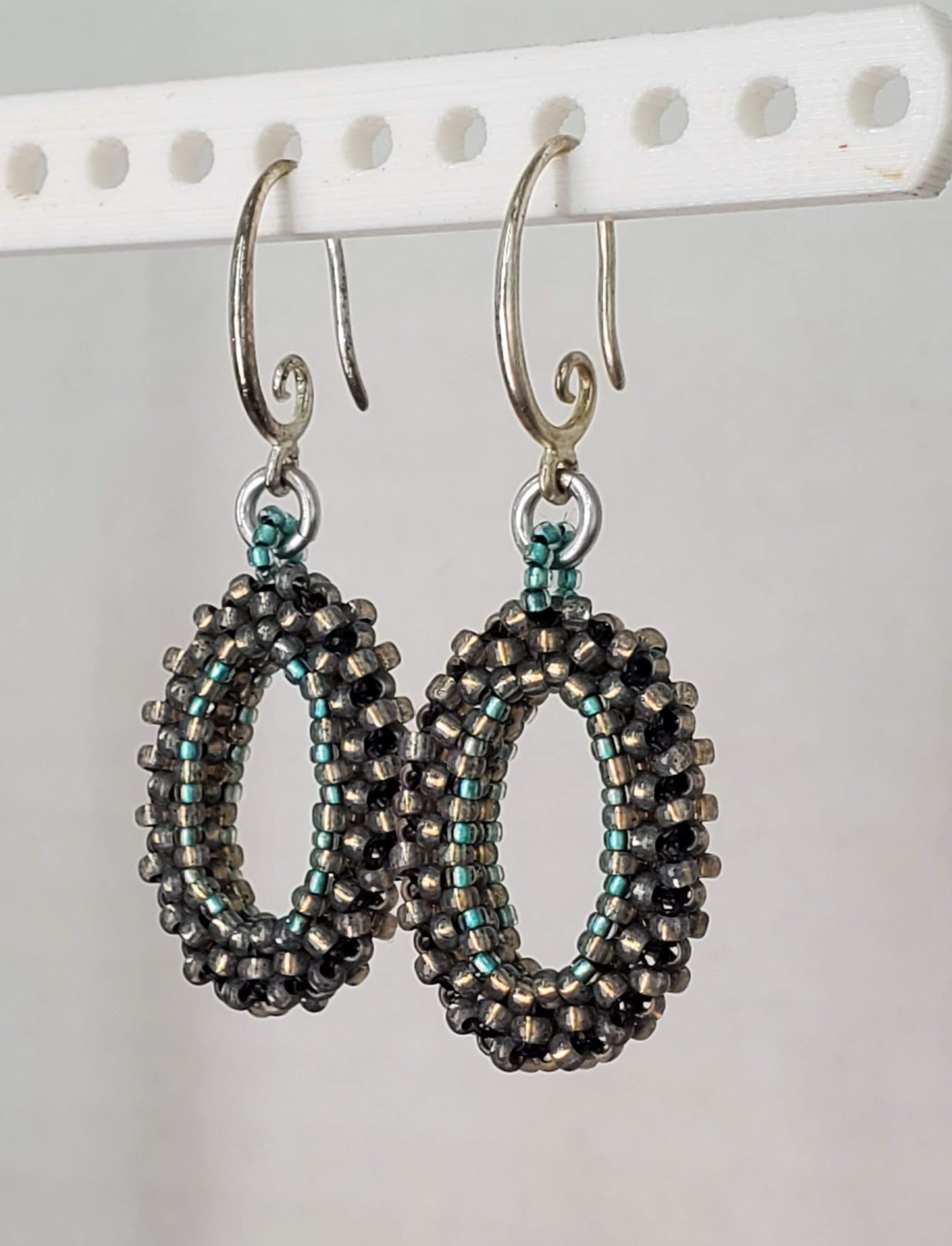 These strange, gray beads have a warm glow about them. Add a hint of teal for charm. Check out those earhooks. The oval itself is 1 inch by 3/4 inch.